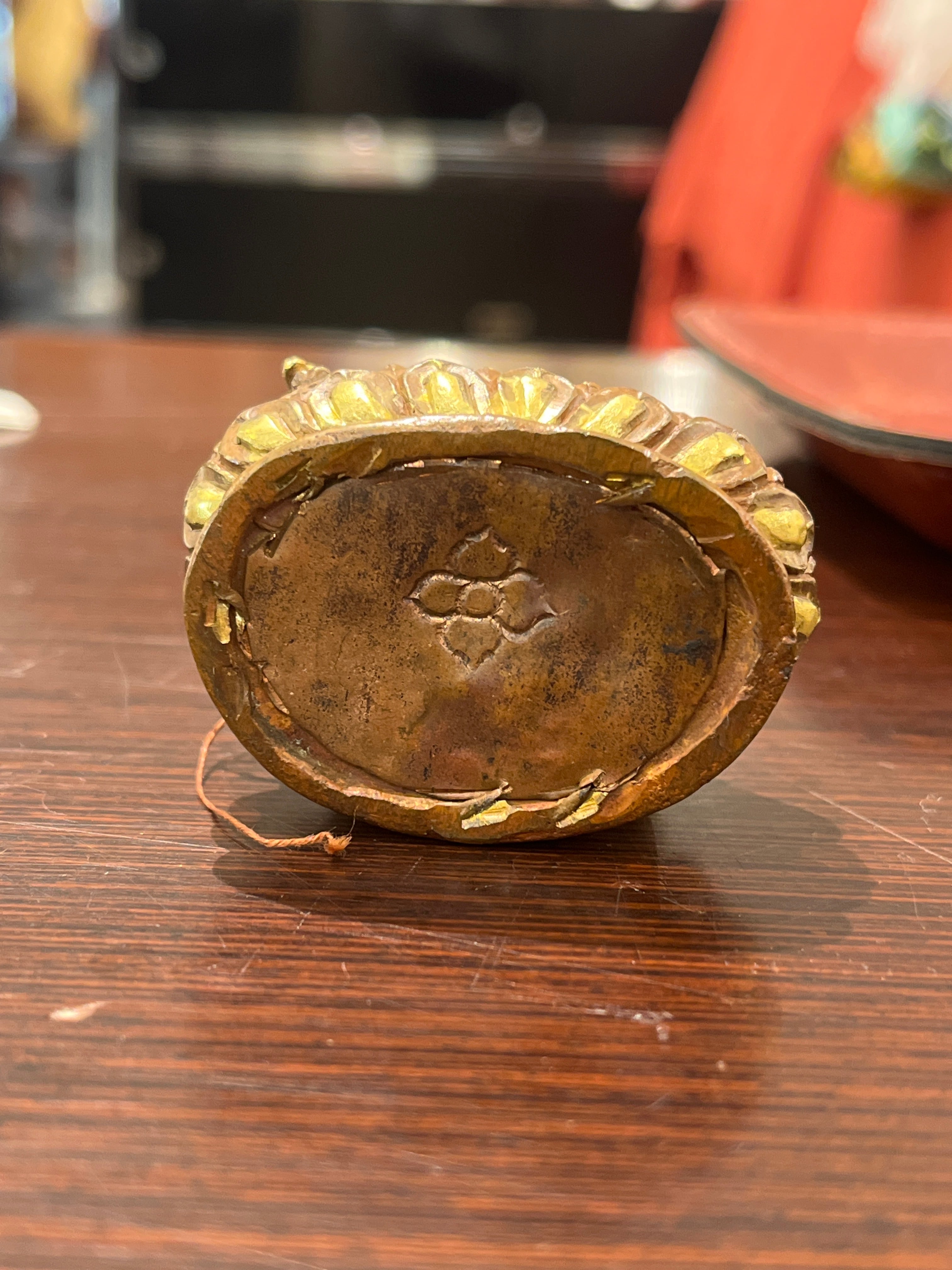 銅製本体に純金メッキを施し、顔は金彩による手描きで開眼されています。底部には金剛杵文様の封印があり、礼拝用仏像として正式に完成した形を備えています。