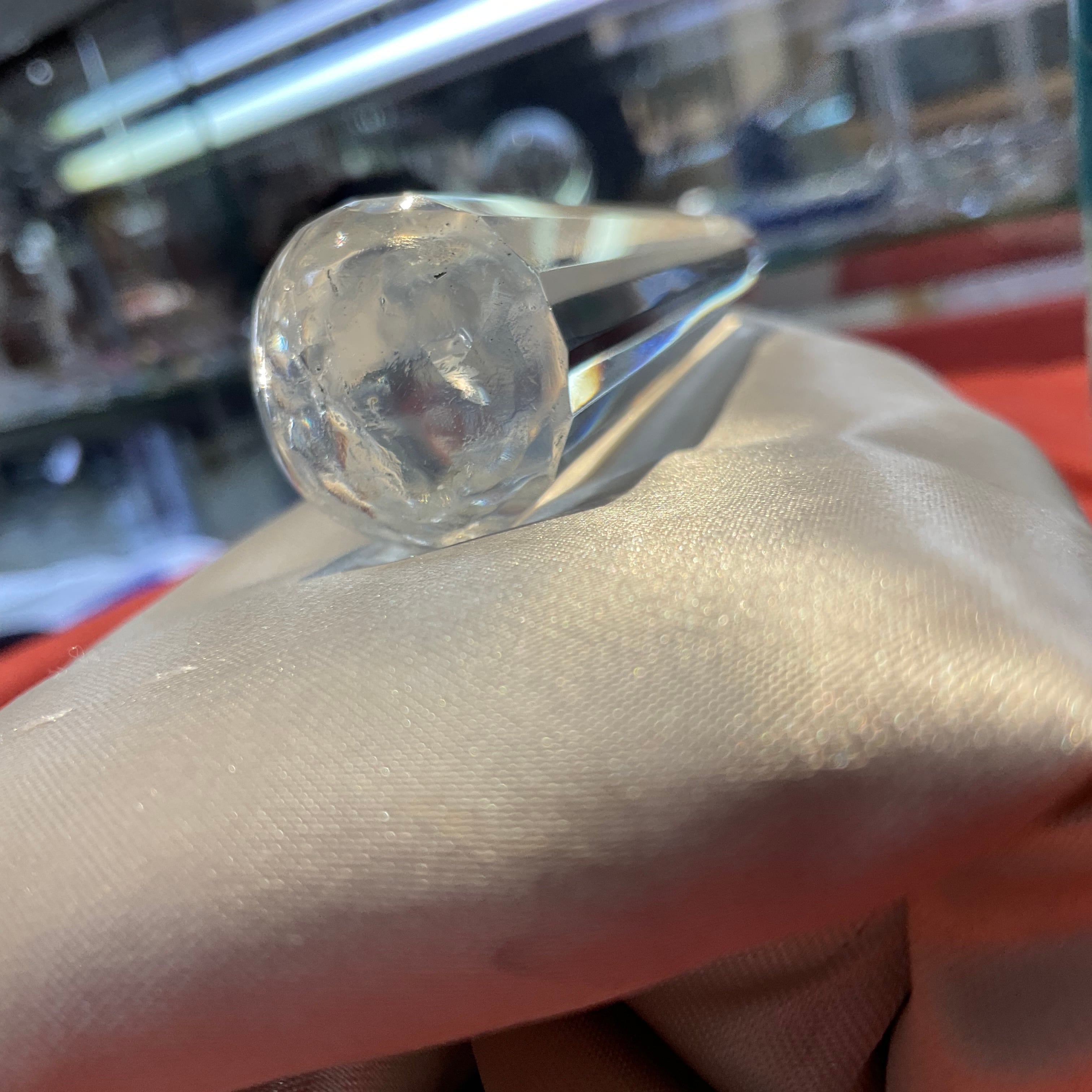 全体的に非常にクリアで、内包物はほとんど見られません。写真で拡大している通り、底面付近にごくわずかに天然由来の内包物が確認できるのみで、水晶本来の澄んだ美しさをしっかりと感じていただけます。