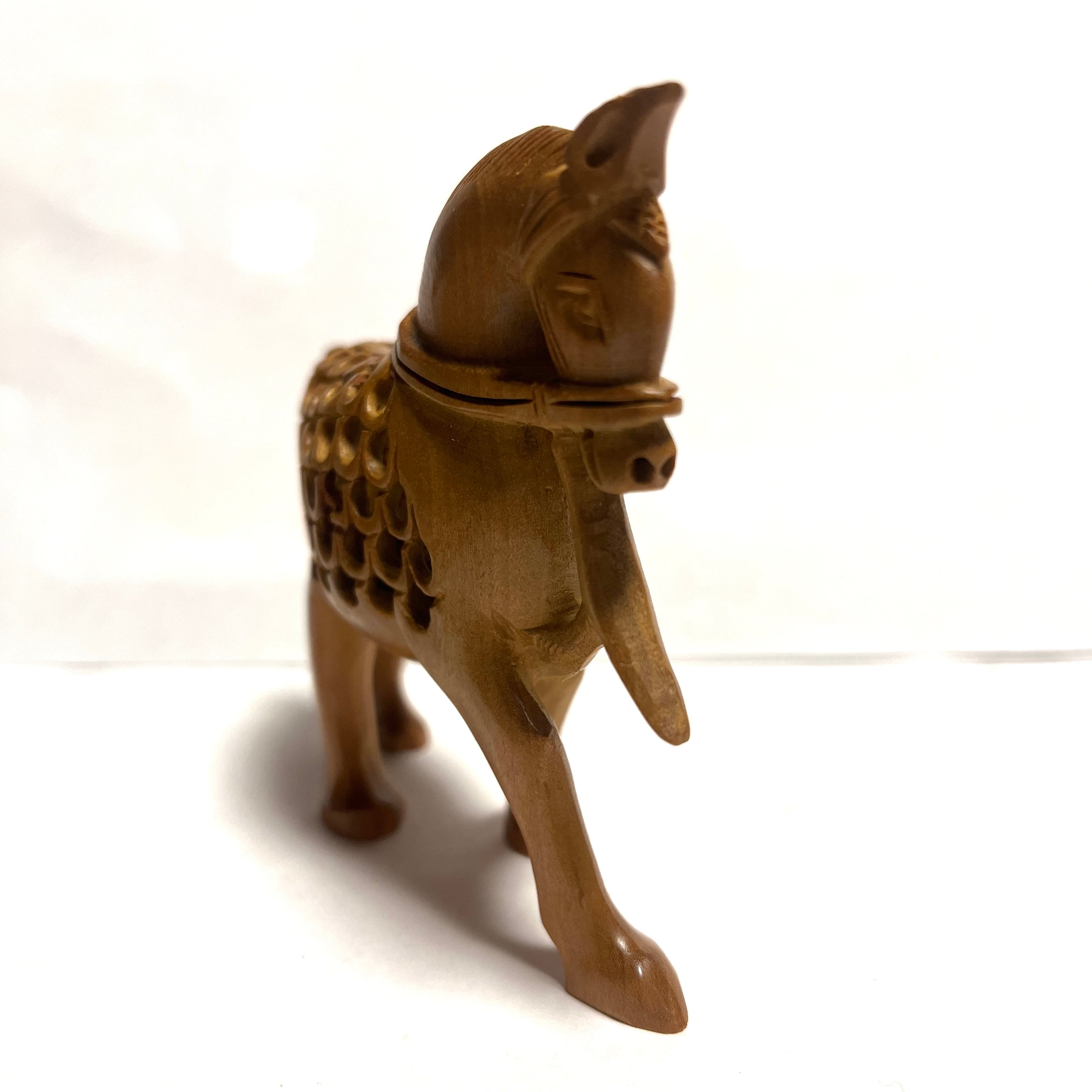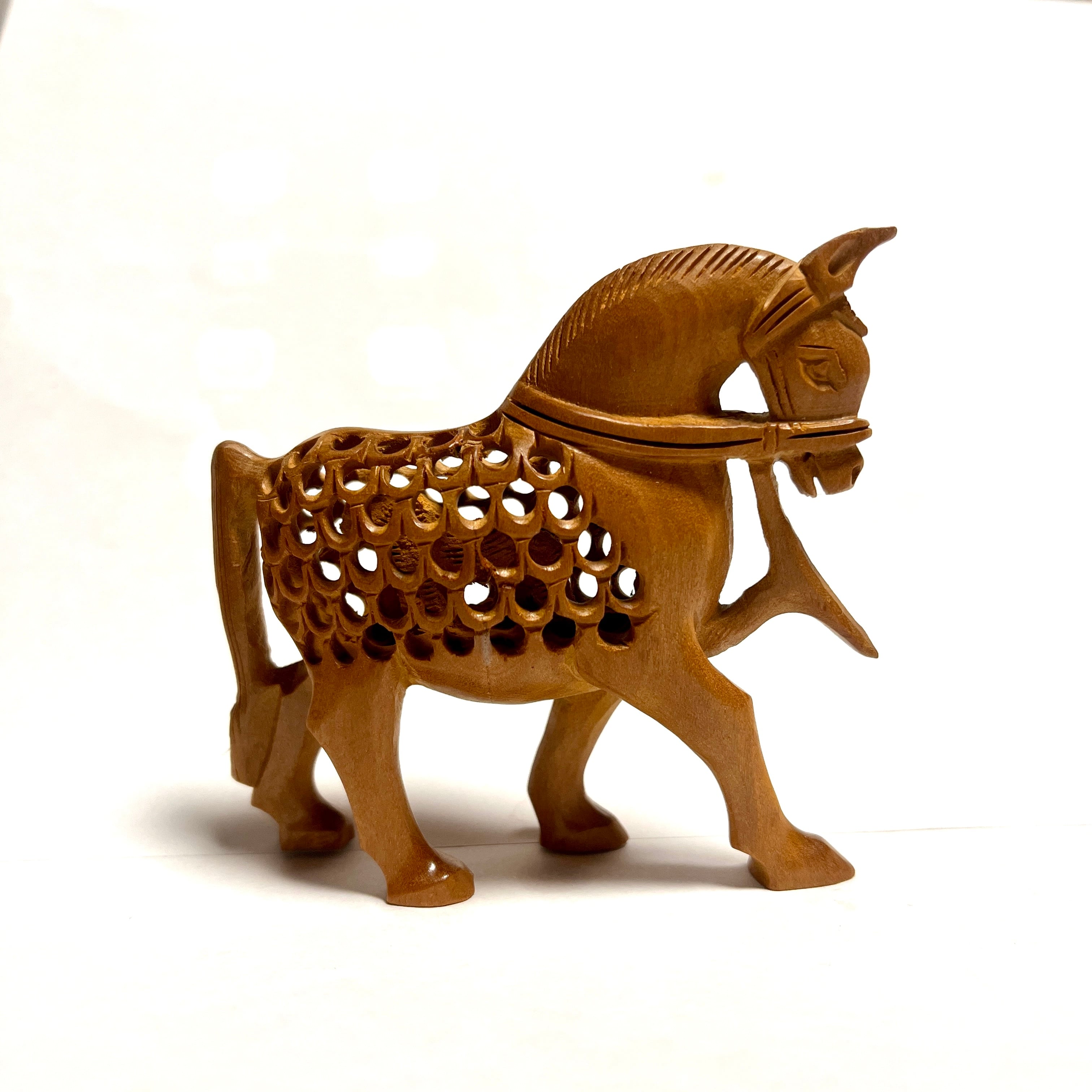 本品は、白檀を一木から彫り出した透かし彫りの馬像で、